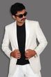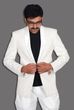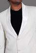 Shown here: Coat/blazer, black tee, & white trouser.